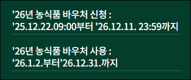 농식품 바우처 신청은 다양한 방법으로 가능합니다. 신청 기간은 2025년 말부터 시작해 2026년까지 이어집니다.