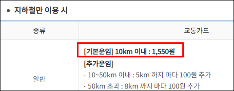 ▶ 15km 이동 (예: 서울역→신도림) :기본 1,550원 + 100원 = 1,650원