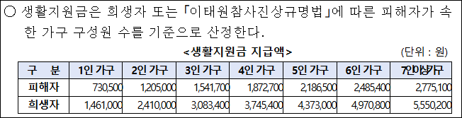 희생자: 1인 가구 146만 1,000원 부터 7인 이상 가구 555만 200원까지 입니다.